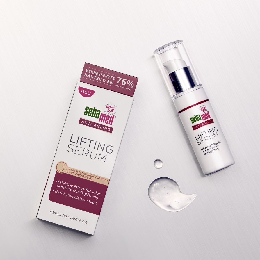 Das neue, hochkonzentrierte sebamed ANTI-AGEING Lifting Serum mit einer Kombination aus den natürlichen Wirkstoffen der Parakresse und 3-fach Hyaluronsäure verhilft zu einer sofort sichtbaren Mimikglättung und – bei regelmäßiger Anwendung – zu einem nachhaltig feuchtigkeitsspendenden Effekt. Das im Parakresseextrakt enthaltene Spilanthol wirkt entspannend auf die feine Mimikmuskulatur und hilft so auf natürliche Weise Krähenfüße, Zornfalten sowie die Fältchen um den Mund zu glätten. Der Pflegekomplex trägt bei regelmäßiger Anwendung zu sichtbar glatterer Haut bei und führt zu 31 Prozent mehr Feuchtigkeit nach 28 Tagen* (*Studie: Zurko, Madrid 2020)