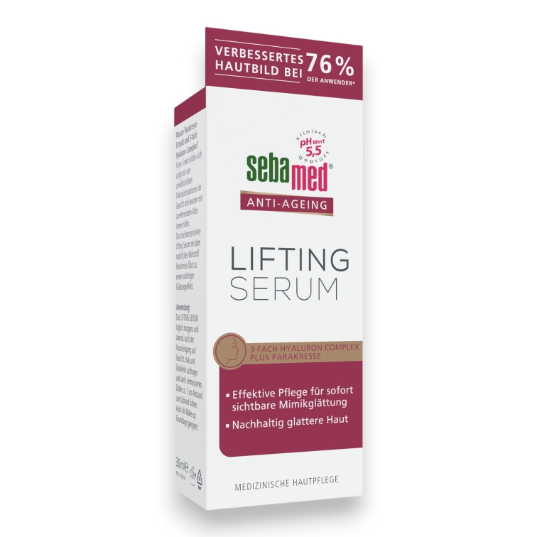Der in der Gesichtspflege-Neuheit sebamed ANTI-AGEING Lifting Serum enthaltende hochwirksame 3-fach Hyaluron-Complex dringt zudem in die tieferen Hautschichten ein und glättet spürbar sichtbare Falten. Während langkettige Hyaluronsäure in den obersten Bereichen der Haut für einen raschen aufpolsternden Effekt durch wirksame Erhöhung des Feuchtigkeitsgehaltes sorgt, bildet mittelkettige Hyaluronsäure auch in tieferen Hautschichten ein Feuchtigkeitsdepot und bewirkt dadurch eine langanhaltende Verbesserung der Hautstruktur. Die kurzkettige Hyaluronsäure dringt schneller und in tiefere Hautschichten ein, trägt so zu mehr Elastizität bei und unterstützt die Aufbauprozesse.
