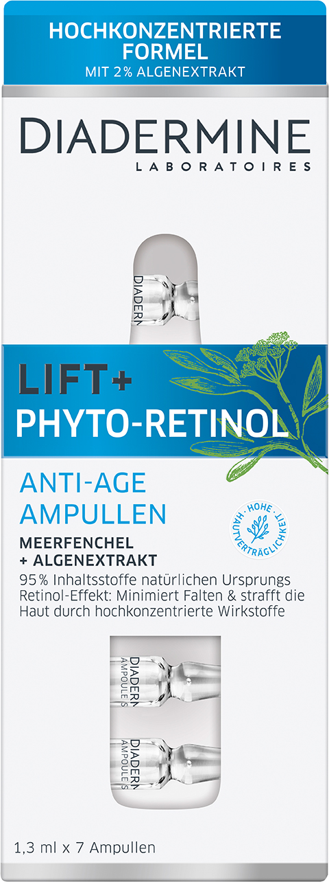 Die neue Linie Lift+ Phyto-Retinol ist Diadermines natürliche Alternative zu Retinol. Ebenso wirksam wie Retinol, aber ohne dessen Nebenwirkungen. Diadermine Lift+ Phyto-Retinol reduziert Falten, verbessert die Elastizität, den Teint, den Feuchtigkeitsgehalt und die Ausstrahlung der Haut. Mit 95 Prozent an Inhaltsstoffen natürlichen Ursprungs (*inkl. Wasser) und hervorragender Hautverträglichkeit setzt Diadermine mit Lift+ Phyto-Retinol eine Formel-Kombination mit nachhaltig gewonnenen pflanzlichen Wirkstoffen wie Meerfenchel-Öl und Algenextrakt gegen die Hautalterung ein. Meerfenchel wird schon seit der Antike in der traditionellen Medizin verwendet. Er fördert die Zellerneuerung und verbessert den Teint. Die Alge gilt wiederum als eines der wirkungsvollsten Geheimnisse des Meeres und wird seit Tausenden von Jahren in der Gesichtspflege genutzt. Die Formel mit Algenextrakt spendet intensive Feuchtigkeit und hilft dabei, Falten zu reduzieren. Tagescreme, Nachtcreme, Augencreme und Ampullen unterstützen die Haut rund um die Uhr und sorgen für einen seidig schönen Teint.