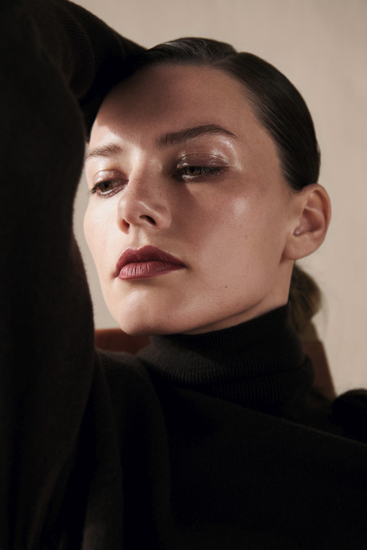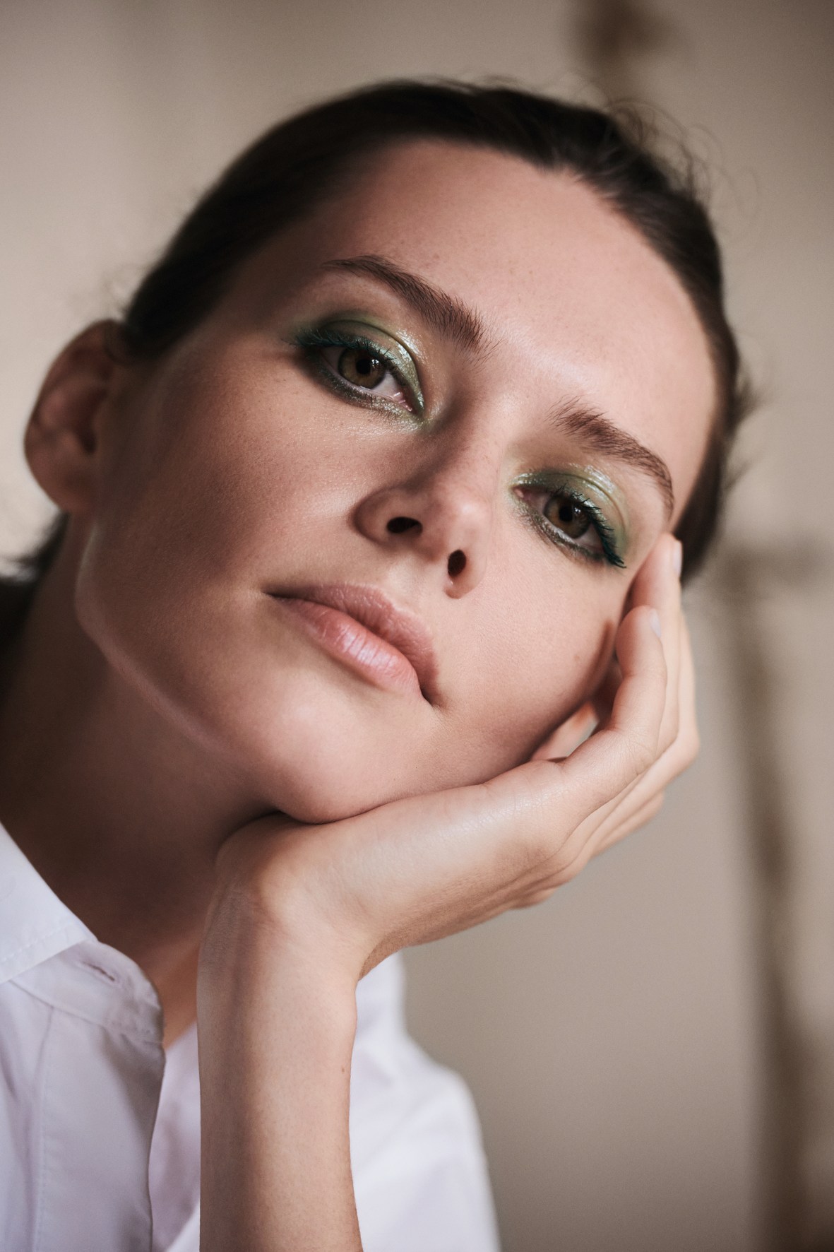 Harmonie und zeitloser Stil durch raffiniert gesetzte Kontraste: Der tiefe Braunton des Magic Shadow 55 Earth verleiht dem Blick sowohl Sanftheit als auch Stärke, während der Eye Performer Truffle die Augen mit intensiver Tiefe betont. Der matte, erdige Rotton des Sensual Lipstick M407 Carmine rundet den Look mit einem selbstbewussten Akzent ab und schafft eine harmonische Balance von Kraft und Gelassenheit.