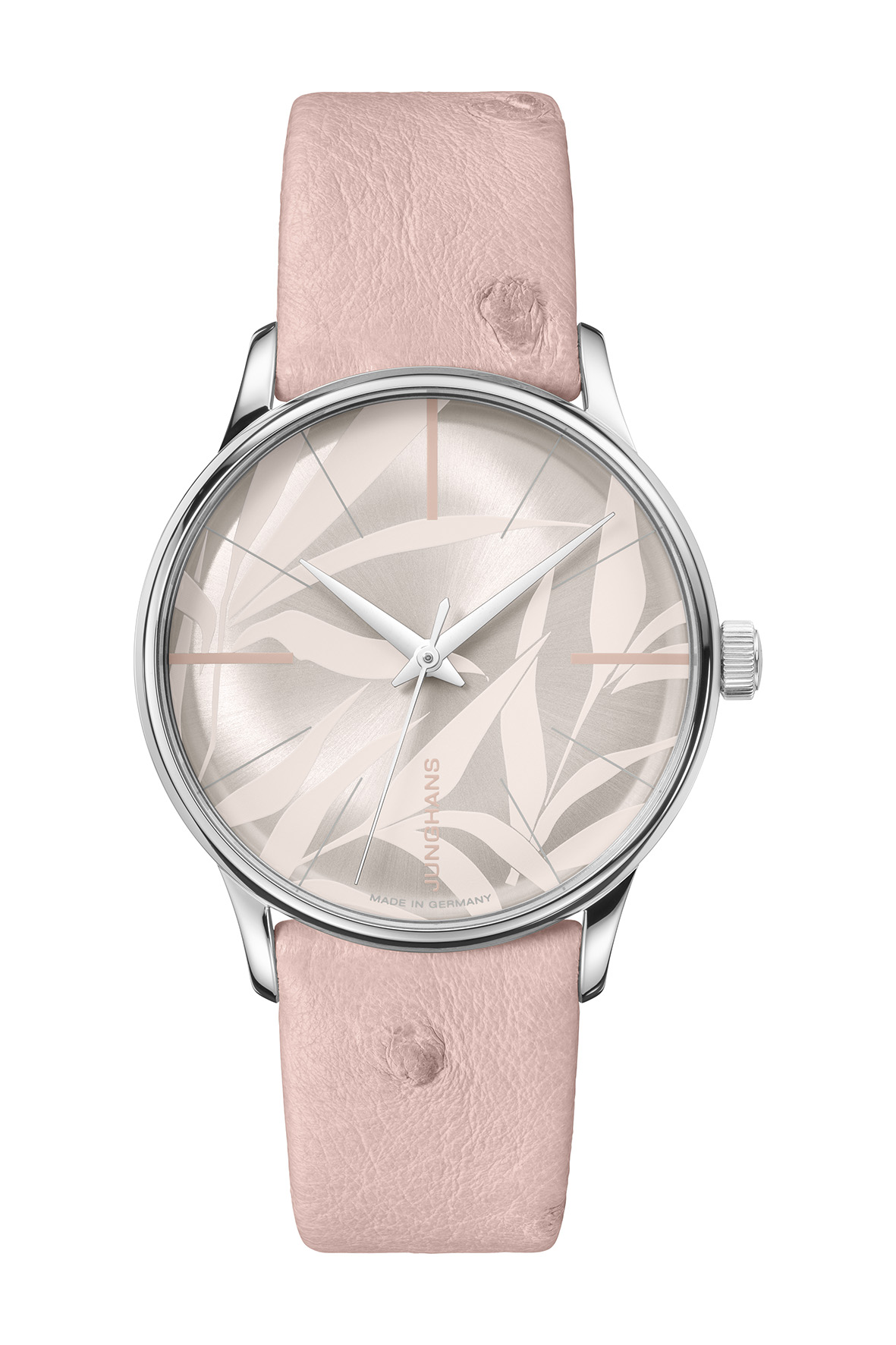 Damen Automatic Von wegen „zartes Pflänzchen“, Bambus ist ja bekanntermaßen sehr robust. Und genau mit diesen Blättern ist das matt versilberte Zifferblatt In Hellrosa-transparent bedruckt. Geschützt wird es von einem gewölbten Saphirglas. Das polierte Edelstahlgehäuse ist mit einem Automatikwerk versehen und wird von einem zartrosa Straußenlederband gehalten. Ton in Ton ein feminin-eleganter Zeitmesser.Automatikwerk, Gehäuse Edelstahl Ø 33,1 mm, Mineralglasboden, gewölbtes und entspiegeltes Saphirglas, hellrosafarbenes Straußenlederband mit Quick Release, wasserdicht bis 5 bar (unverbindliche Preisempfehlung: 1.440 Euro, 27/3242.00)