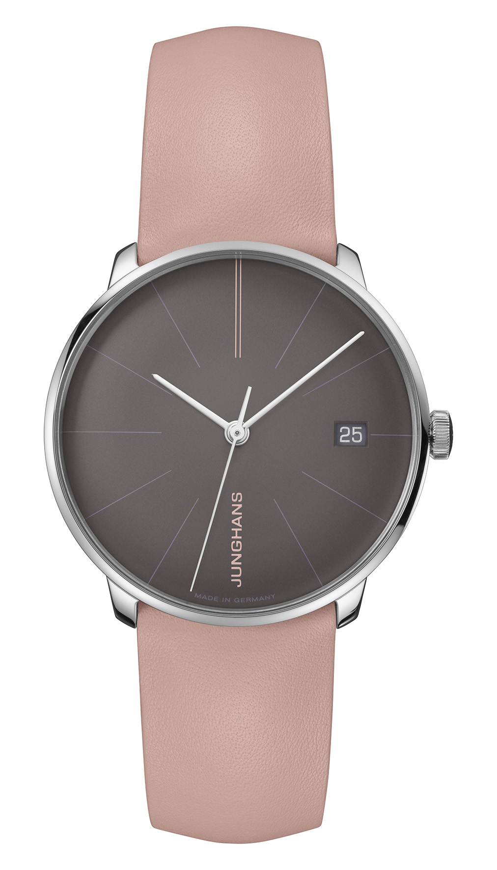 Junghans setzt für Damen auf sanfte Rosatöne in Kombination mit Grautönen und floralen Elementen. Das Ergebnis sind zarte Zeitmesser mit starken Details wie einem schwarzen Gehäuse oder farblich kontrastierenden Bandnähten. Schon gewusst: Rosa galt seit der Renaissance als das kleine Rot und wurde viele Jahrhunderte als Zeichen der Stärke getragen. Somit steht Rosa bis heute nicht nur für Leichtigkeit, Eleganz und Romantik, sondern auch für Stärke, Souveränität und Selbstbewusstsein.Denn während Rosa zwar weiterhin als feminin und romantisch gilt, verleihen heute neue Materialien, moderne Formen und klare Designs der Trendfarbe einen selbstbewussten und kraftvollen Ausdruck.
